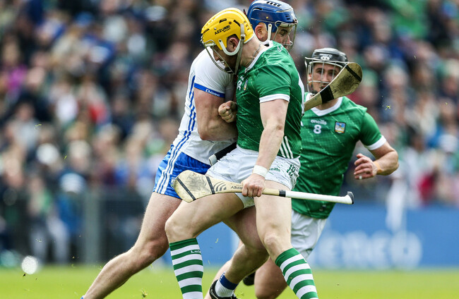 Waterford scrambled. Tom Barron had the ball barrelling down the wing and tossed Gearoid Hegarty like a great redwood. He was caught then with two fair and clean shoulders and the ball was turned over.