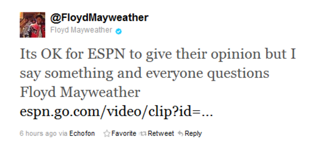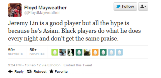 Mayweather, helpfully referring to himself in both the first and third person, cited a conversation on ESPN where the panel discuss whether race is a factor in Lin’s popularity.