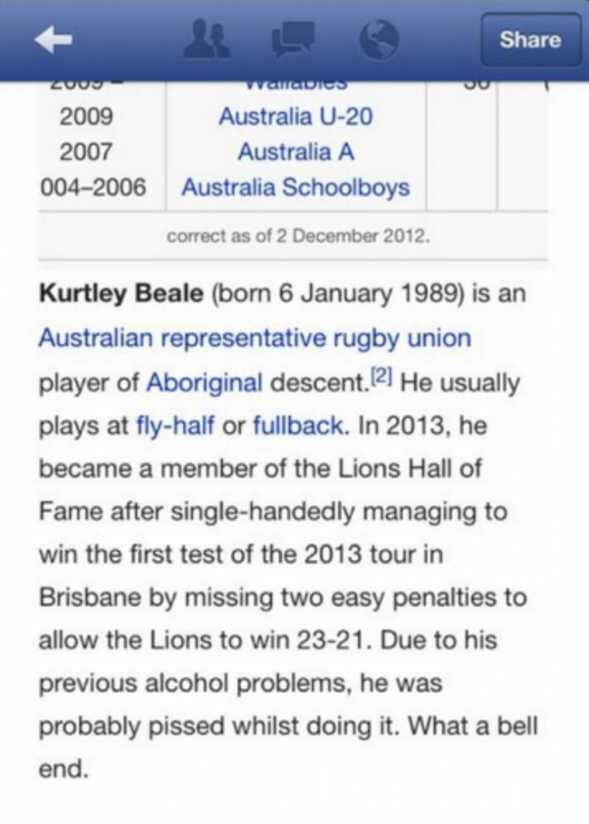 Irate fan changes Kurtley Beale's Wikipedia page after penalty slip-up