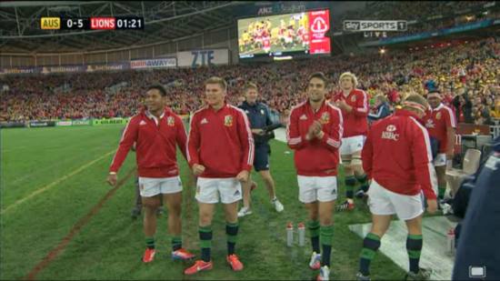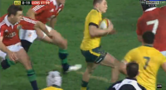 Yessiree! Aussies caught holding on at the breakdown. Great defence from the Lions and the camera focuses on Parling. Beale has switched to outhalf.