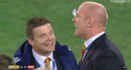 Hugs on the bench for the players from Gatland. Halfpenny named man-of-the-match. Jamie Roberts in tears. Lions pressing for one last score. Lineout 5m out. Here comes the 12-man lineout…