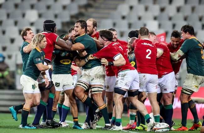 Lions captain Alun Wyn Jones didn’t like Makazole Mapimpi’s actions on the ground in a tangle with Conor Murray and that’s where things kicked off, Springboks lock Eben Etzebeth quickly wading in to square up to the Welshman.
