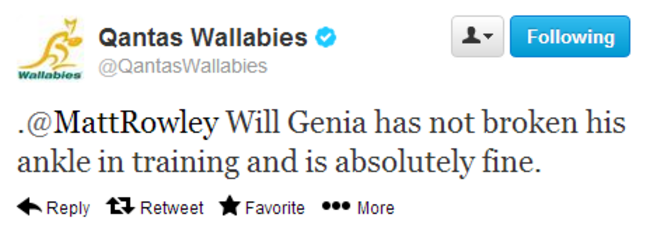 Wallaby fans were in a quiver when word of a Genia training ground injury, picked up after a purported Adam Ashley Cooper tackle, spread like wildfire across social media. Matt Rowley, editor of the Green and Gold Rugby website, contact the Wallabies and got this soothing message in response.