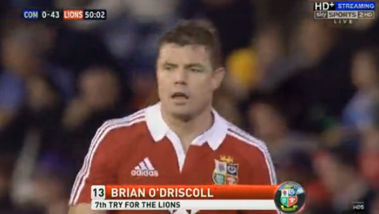 Nine minutes they kept them out for. The Lions hoover in the C.C players by going through the phases before going left and wide. Maitland finds O’Driscoll on the overlap and the captain dives over. Halfpenny then MISSES his first conversion attempt.