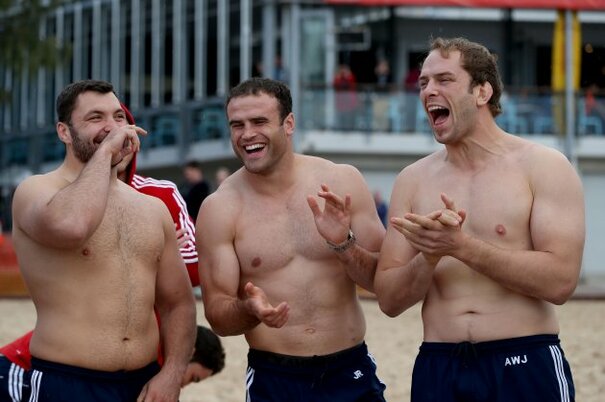 Alex Corbisiero, Jamie Roberts and Alun-Wyn Jones have a laugh at their team-mate's expense