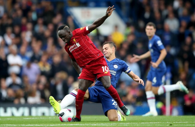 Mane is lurking, but César Azpilicueta does well to make a sliding interception to prevent the ball reaching the attacker.