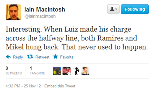 Fernando Torres is having to battle for the ball up front. Minutes after a free is given against him, he tangles for a 50-50 with Azpilicueta and wins the free-kick out on the right wing.