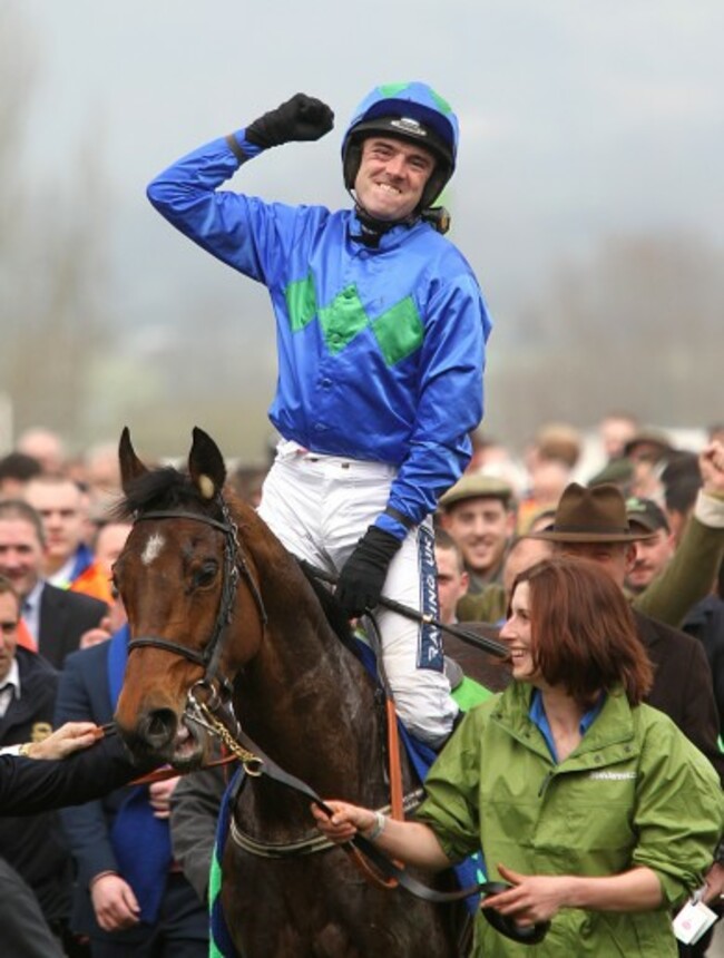 Ruby Walsh celebrates on Hurricane Fly after winning the Stan James Champion Hurdle Challenge Trophy on Centenary Day at Cheltenham. David Davies/PA Wire/Press Association Images