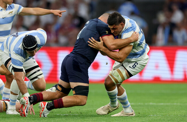 An early card after a collision between Tom Curry and Juan Cruz Mallía after the Argentina player collected a high ball. It’s head-on-head and the Pumas fullback comes out with a nasty bang.
