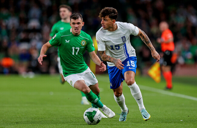 Greece's Konstantinos Koulierakis and Ireland's Sammie Szmodics. Morgan Treacy / INPHO