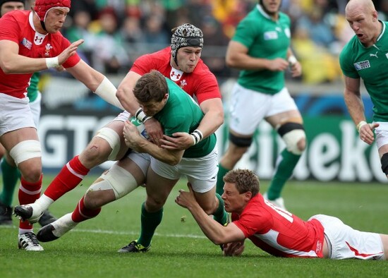 Brian O’Driscoll tackled by Dan Lydiate and Rhys Priestland of Wales (©INPHO/Dan Sheridan)