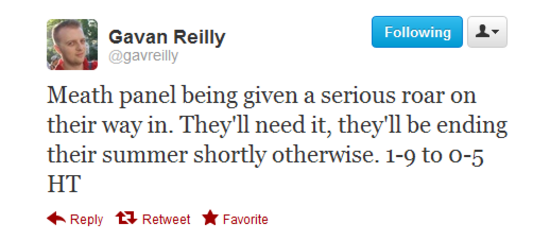 Laois 0-3 Meath 0-3 – 8 mins: Meath show patience in the build up and find an opening for Graham Reilly to advance forward and shoot between the posts.