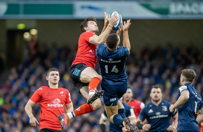Ulster find Leinster standing firm in defence, but Cooney lofts a super high contestable just outside the Leinster 22 and Baloucoune manages to disrupt Dave Kearney and take the ball after it hit the ground.