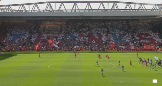 ‘You’ll Never Walk Alone’ rings around the ground while the Liverpool fans unveil a mosaic spelling out the word ‘Thanks’ for the support they received from Everton during their Hillsborough campaign.