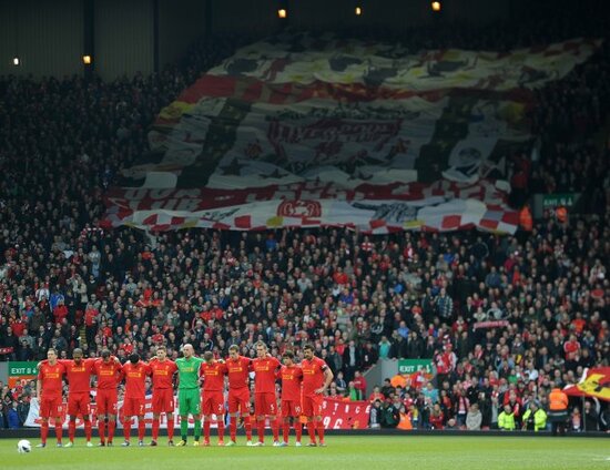 The Liverpool players observe a minute silence before the Barclays Premier League match at Anfield (Martin Rickett/PA Wire/Press Association Images).