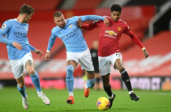 Manchester United's Marcus Rashford (centre) is challenged by Manchester City's Kyle Walker (right). PA