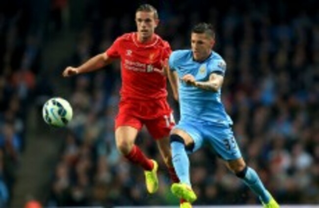 Man City's Stevan Jovetic and Liverpool midfielder Jordan Henderson. Peter Byrne