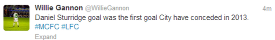 Liverpool are level. The ball is worked well but should be cleared by Garcia. When it falls to Sturridge just outside the City box, he hits a crisp drive through the bodies and into the bottom corner.