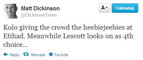 Twitter seems in agreement that City are in disarray – Mancini is furious at Balotelli, Tevez is furious at Mancini, Kompany is furious at himself and Fergie is reading a nice book on the United bench.