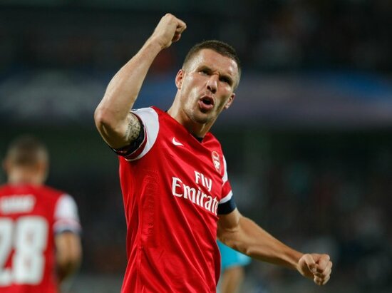 Arsenal’s German forward Lukas Podolski celebrates his goal tonight. (AP Photo/Claude Paris)