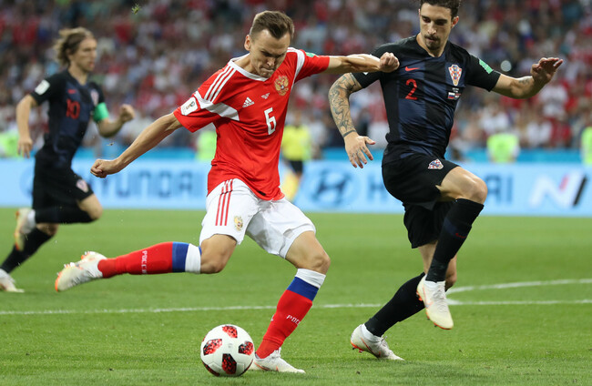 (SP)RUSSIA-SOCHI-2018 WORLD CUP-QUARTERFINAL-RUSSIA VS CROATIA Sergey Ignashevich (L) of Russia competes for a header with Mario Mandzukic (C). Xinhua News Agency / PA Images Xinhua News Agency / PA Images / PA Images
