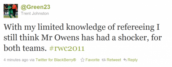 RED CARD!!! Deary me. Ill-discipline from the Samoans, as Paul Williams “strikes” Heinrich Brüssow in the face. More of a slap, but Nigel Owen adjudges it to be a red card offence committed by Williams.