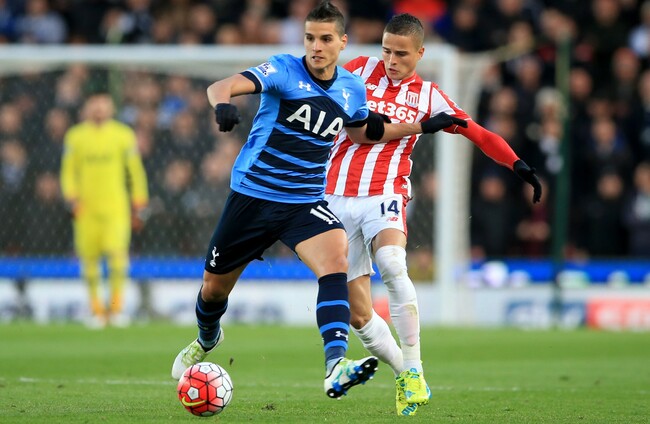 Chadli dribbles past a few Stoke players before firing the ball over the bar when through.