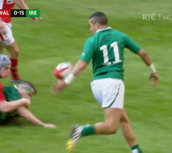 Just when we felt that the Munster wing wasn’t getting a touch, Ireland’s scrum launches a terrific back line move from right to left.