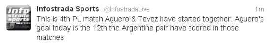 Nasri whips in a dangerous cross but Tevez does not anticipate the ball. The Aguero goal was, incidentally, league goal number 86 for City.