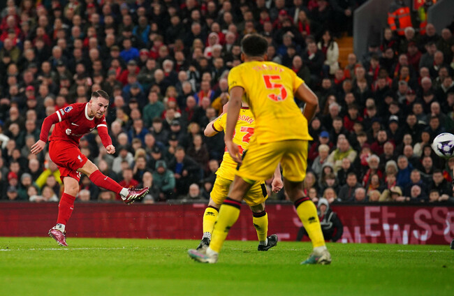 THE NERVES AND anxiety that began to seep into Anfield on another crucial night in this Premier League title race were shredded in an instant by the sheer class of Alexis Mac Allister.