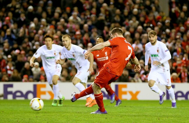 AN EARLY JAMES Milner penalty saw nervy Liverpool beat Augsburg 1-0 in the Europa League tonight as Jurgen Klopp’s men reached the last-16.