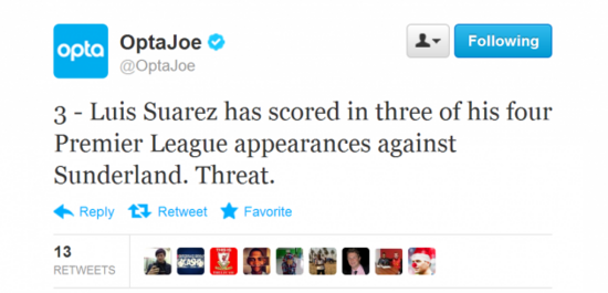 Liverpool 2-0 Sunderland: Luis Suarez shrugs off the challenge of Cuellar and runs through on goal, slotting it between Mignolet’s legs (24 mins).