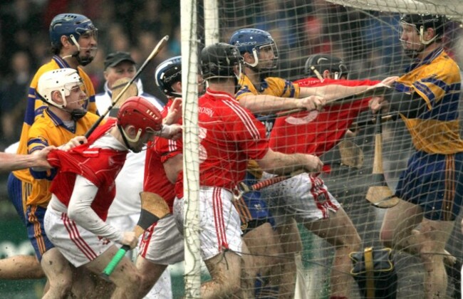 Tempers flare in the Clare SHC final between Sixmilebridge and Crusheen in Ennis. (INPHO/Donall Farmer)