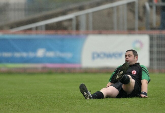 Referee Eamonn McHugh pulls a hamstring during the Tyrone senior decider. (INPHO/Presseye/Russell Pritchard)