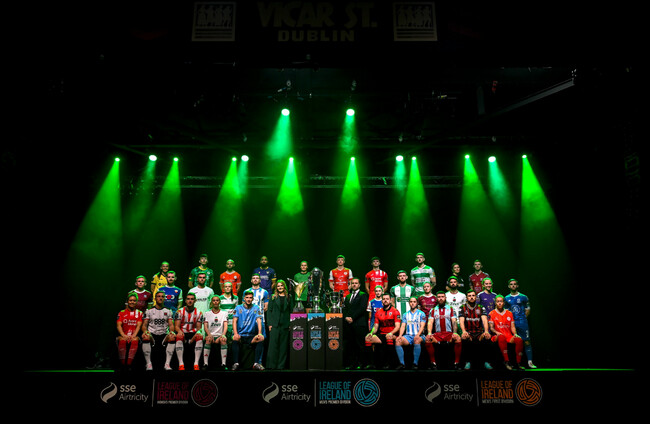 Mark Scanlon and representatives of each LOI club at the season launch event at Vicar Street, Dublin. Stephen McCarthy/SPORTSFILE