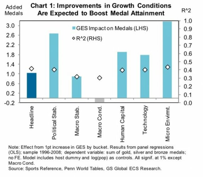 Note that China is actually expected to see a sequential decline in total medals, thanks to the fact that it’s losing its home-country benefit from 2008, when the games were hosted in Beijing. According to Goldman, home countries outperform their expected haul by 54%!