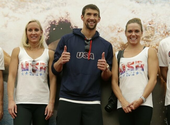 Members of the US swim team Natalie Coughlin, right, Michael Phelps and Jessica Hardy in London this week. (AP Photo/Lee Jin-man)