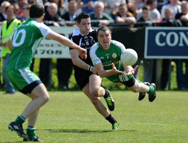 Shane Mulligan passes to teammate Greg Crowley as Frankie Quinn looks on