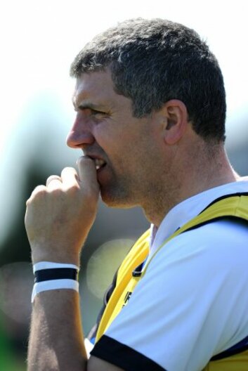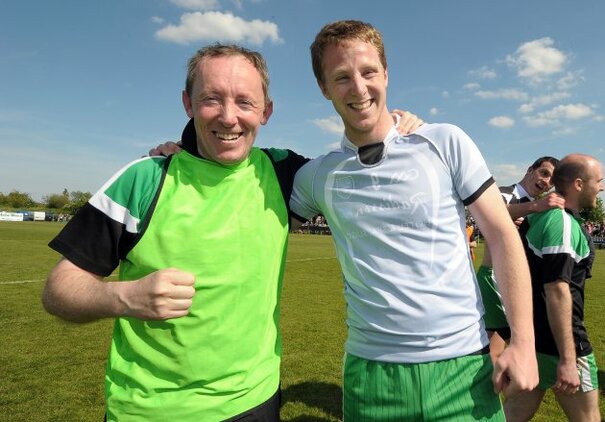 Ciaran McCallion celebrates as Barry Mithchell supplies the water