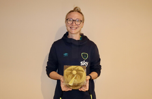 Louise Quinn with her gold cap to represent 100 appearances for the Republic of Ireland Women's National Team. FAI Media.