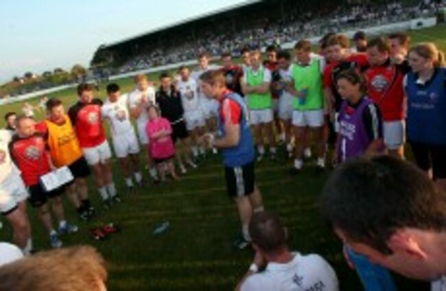 Kieran McGeeney speaks to the Kildare players at the final whistle. INPHO/Donall Farmer Information