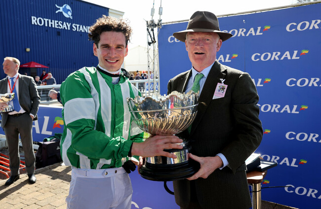Jockey Danny Mullins and trainer Willie Mullins with the trophy after Macdermott won the Coral Scottish Grand National Handicap Chase. Alamy Stock Photo