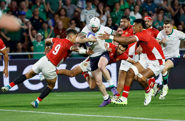 Caelen Doris is tackled by Halaleva Fifita of Tonga. Laszlo Geczo / INPHO