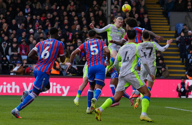 Matheus Nunes took up the ball on the right and sent over a big, reaching cross. Chris Richards leapt but it sailed over him, and there hanging in the air behind him was Haaland, rising high and powering a header down into the ground and past Henderson.