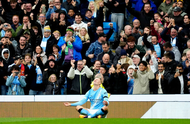 Harry Maguire this time gave away possession to Bernardo Silva, who set Haaland racing away into the vacant United half, and he kept his cool to score for the eighth time in nine appearances against United.