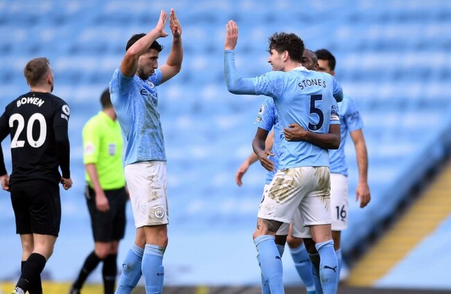 IN-FORM CENTRE HALVES Ruben Dias and John Stones struck as Premier League leaders Manchester City moved 13 points clear with a hard-fought 2-1 win over West Ham this afternoon.