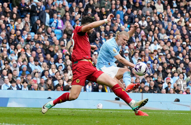 ERLING HAALAND SCORED four goals – including a first-half hat-trick – as champions Manchester City crushed Wolves 5-1 to retain control of the Premier League title race.
