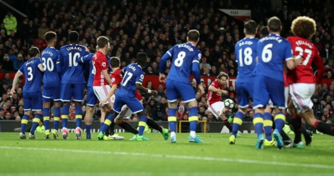 Mirallas gives away a stupid free kick by rag-dolling Jesse Lingard to the floor. Blind and Young stand over it before the Dutchman cracks it in.