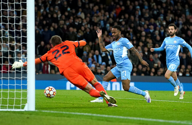 RAHEEM STERLING NETTED as Manchester City struck three times in the second half to move closer to the Champions League last 16 with a 4-1 win over Club Brugge.