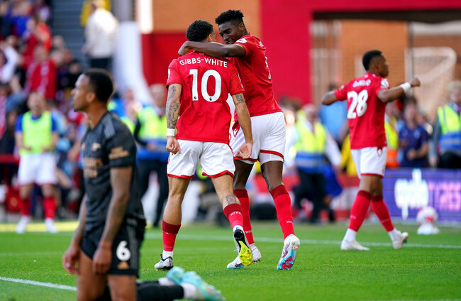 Martin Odegaard loosely passed straight to Morgan Gibbs-White who surged forward at pace before feeding Awoniyi, who enjoyed a bit of fortune as Gabriel’s challenge bobbled against his leg and he scuffed past Aaron Ramsdale.